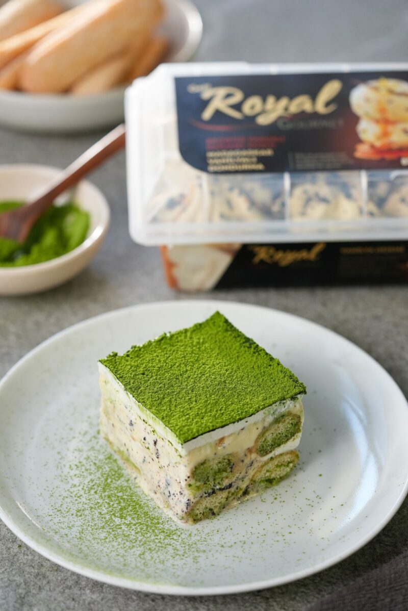 Aynı sıralamayı – matchalı bisküvi, dondurma, krema – olacak şekilde kat kat tekrarlayın.
